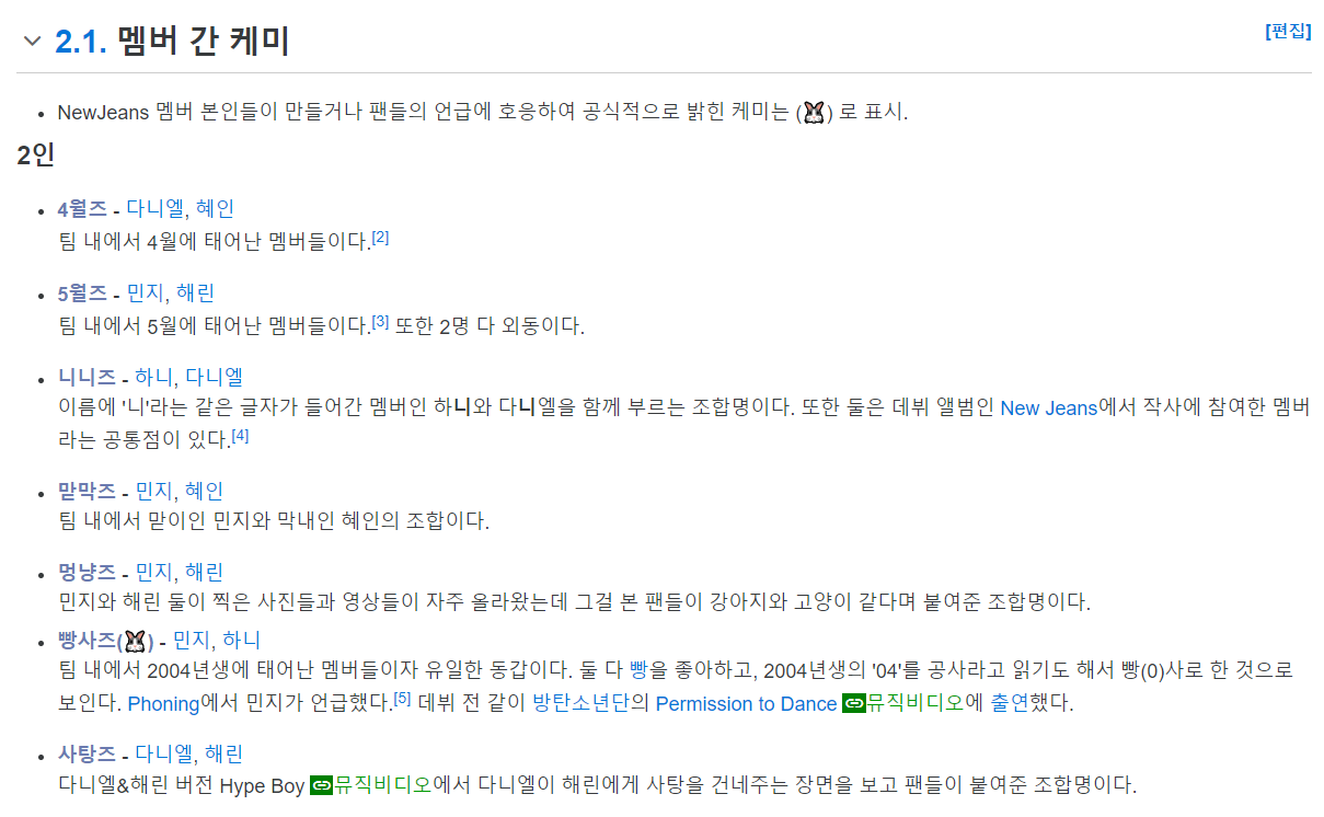 벌써부터 나무위키에 멤버간의 케미가 있어요. 정말 자세한 나무위키